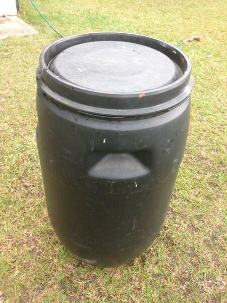 Black plastic 200 litre drum.