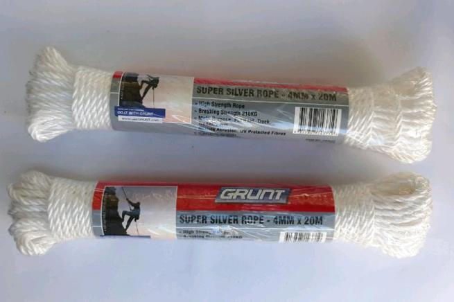 ... packs white Grunt Super Silver rope 4mm x 20m. Multipurpose, resists abrasion, UV protected fibres, ...