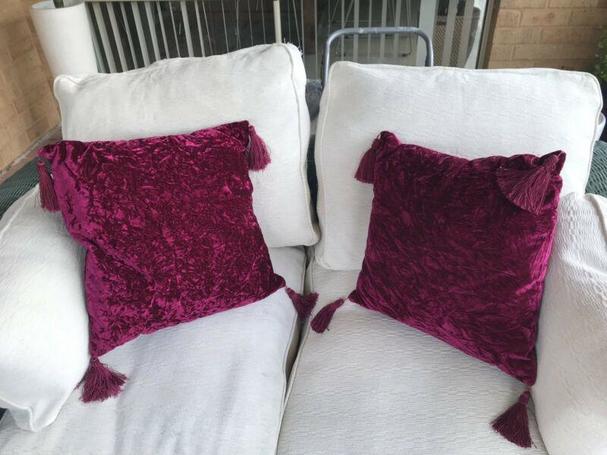 Two burgundy crushed velvet tassel cushions just used for display $20 for two