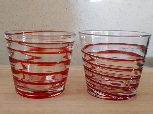 TWO NEW CLEAR GLASSES WITH RED GLASS SWIRL $ 7.50 EA.