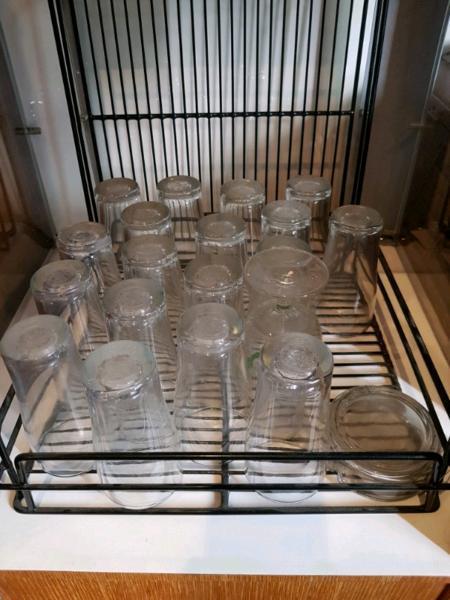 ASSORTED DRINK GLASSES BEER MIDDIES AND 2 RACKS 0