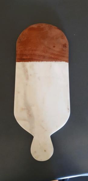 Oval marble and wood paddle board for serving cheese or antipasto.