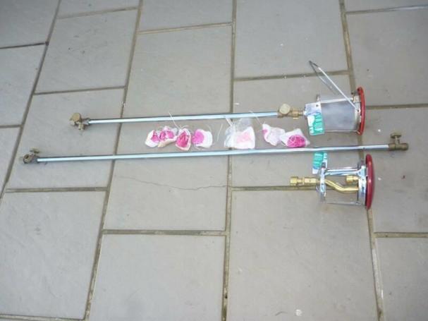 2 gas extended arm lights with 7 wicks 1 has no glass