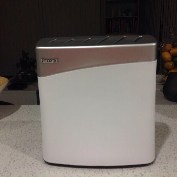 New Baccarat knife block.Knives not included.Holds 6 knives.Block has a slick modern edge with a seamless construction.Only 12cm wide and 25cm high.