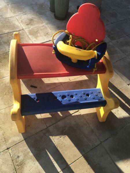 Excellent condition mamas and papas baby swing, has harness, music, lights, batteries included, removable bar, can recline and comes with the two original toys.