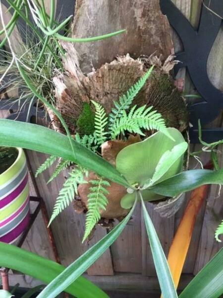Elkhorn Fern attached to a old palm leave base with self seeded fern.