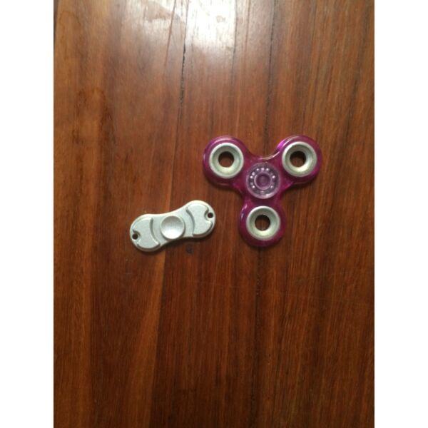2 fidget spinners that include a purple 3 wheeled one and a silver 2 wheeled one.