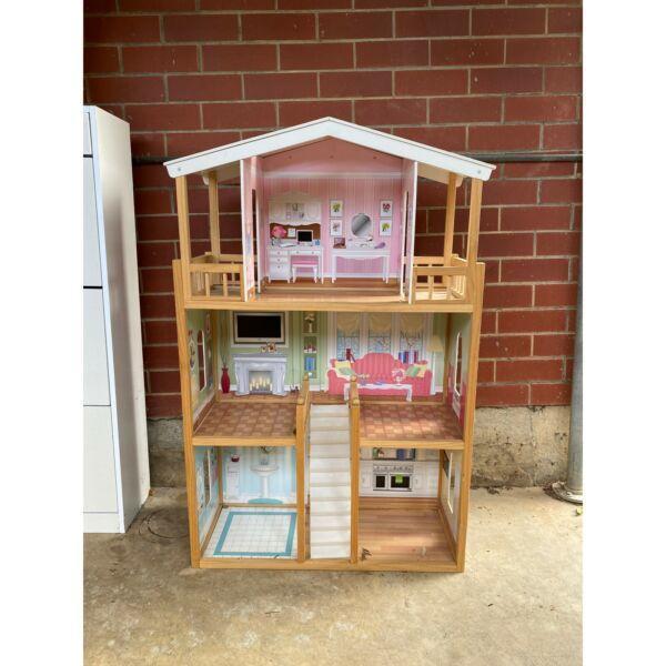 Kids wooden toy barn. Opening doors, side and removable roof sections. Approx 1:16 scale, fits Bruder tractors. Excellent condition.