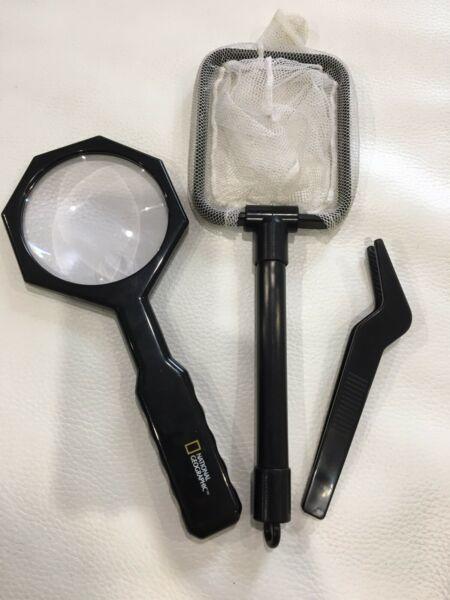 National geographic magnifying glass, bug catching net and tweezers.
