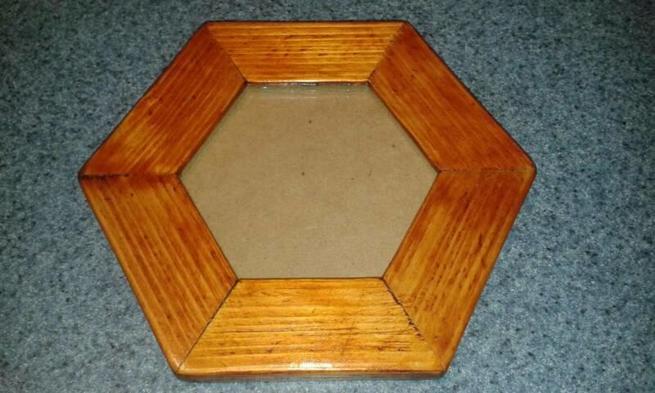 Handcrafted hexagon shaped photo frame, made from reclaimed pine with a maple gloss finish.
