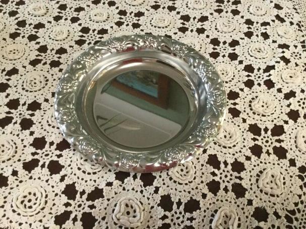 white tin bowl. can be used for anything. was used to keep soaps and bath products in.