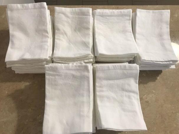 94 thick white cotton napkins. Used at our wedding. They have been washed and ironed and measure approx 43 x 43cm each. They come in a large plastic tub for easy
