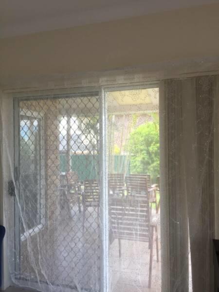 Curtains, rubber backed with tiebacks, top frill and rails