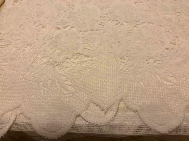 This curtain fabric has a decorative edge and is also scalloped at the bottom. It is already sewn at the top so the rod can be threaded through. It is new and never been