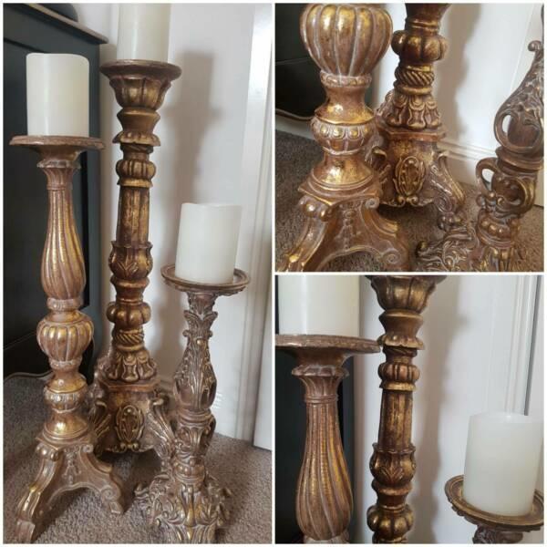 3 Gold Candlesticks in perfect condition, different sizes & styles