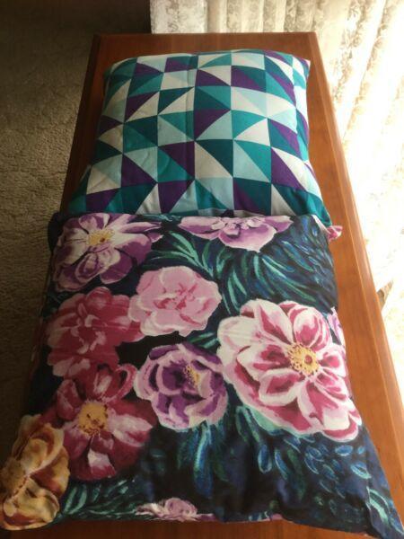 Floral one has zip off cover, cushions approx 38cm, $5 each.