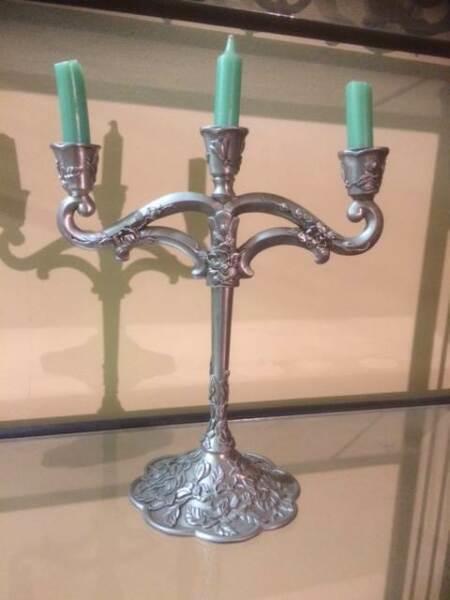 Solid pewter candlelabra home decor. ideal wedding or engagement present. I bought this in halifax, canada which renown for its pewter. dimensions: height 30cm width