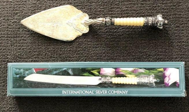 Never used, international silve company brand knife and cake server. A quick polish will refresh them.