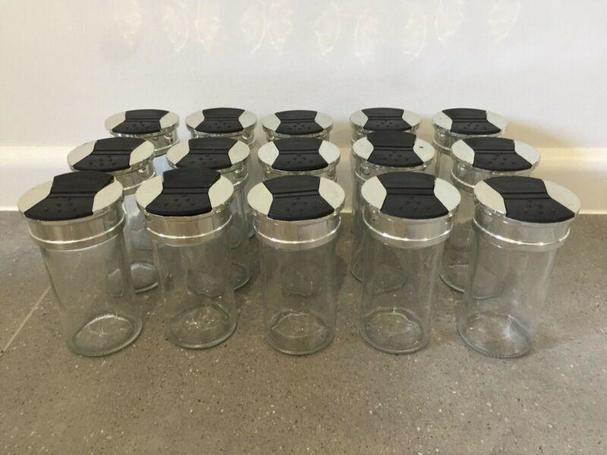 15 jars never used with shaker side and larger opening on the other side for teaspoon.