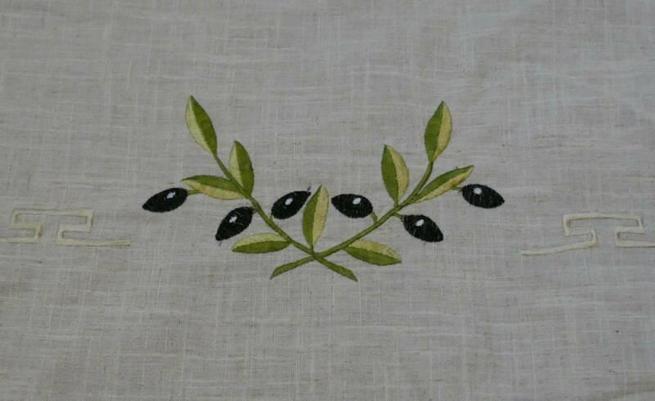 Large linen tablecloth with olive motif. Never used. Could alternatively be used as a bedspread.