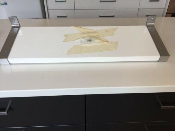 New shelf, solid, white with silver brackets. Never used includes fittings (taped on). Great for laundry or child's bedroom.