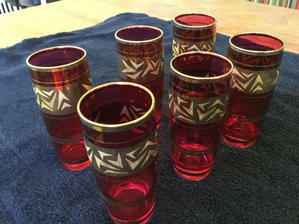 6 retro highball glasses. Red and gold design. In excellent condition. Pick up only.