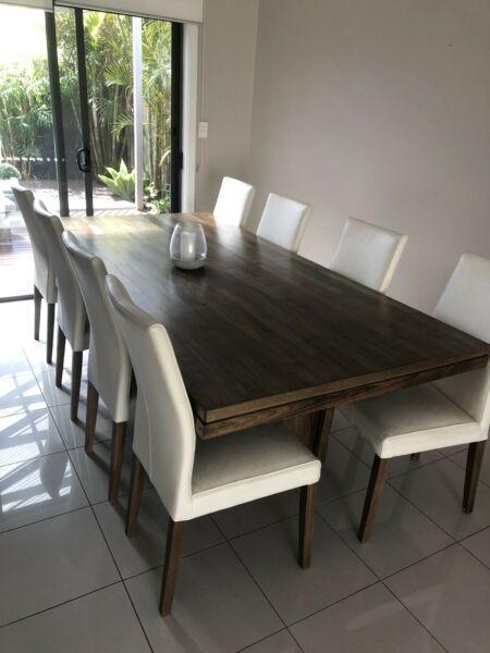 Solid table length 2.4m x 1.150m plus 8 leather chairs. Great condition. Pick up only