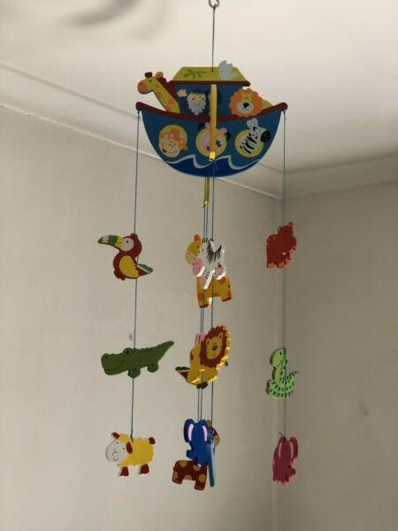 Gorgeous brightly coloured wooden Noah's Ark mobile for a baby's room in excellent condition.