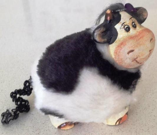 Cute cow. Made of clay craft with synthetic fur. Height: 8.5cm Length: 8.5cm. Small chips on front legs and one ear but doesn't detract from cuteness and can be touched
