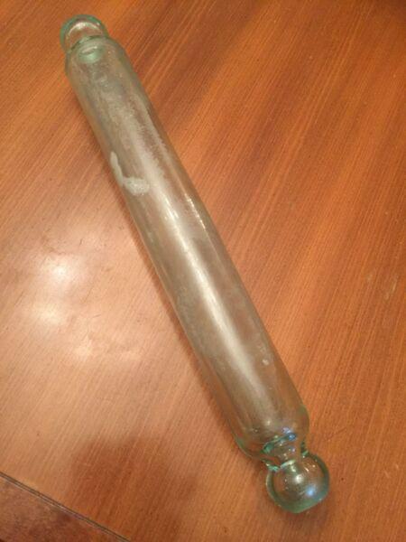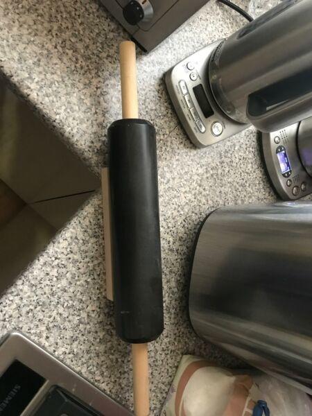 The rolling pin is heavy made from marble. The marble roll has wooden shaft and rest.